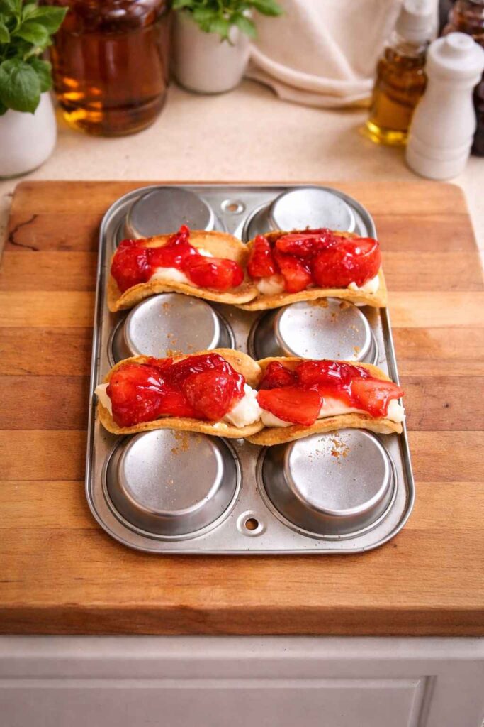 The Strawberry Cheesecake Taco is more than a clever novelty — it is a genuinely well-engineered dessert that rewards both its creator and its recipient with equal generosity. What makes this recipe so enduringly relevant is its perfect alignment of technical accessibility with dramatic visual and flavor payoff. The inverted muffin tin trick, arguably the most ingenious element of the entire process, turns a piece of equipment found in virtually every kitchen into a professional pastry mold. The no-bake cheesecake filling — stabilized by powdered sugar, deepened by instant pudding mix, and brightened by fresh lemon — produces a result that rivals far more labor-intensive pastry shop creations in both flavor and texture. And the fresh glazed strawberries on top provide not just sweetness but the kind of glossy, jewel-toned visual drama that makes this dessert inherently and effortlessly photogenic. From an adaptability standpoint, this recipe is endlessly versatile: swap the strawberries for fresh blueberries, ripe peaches, or a dark chocolate ganache drizzle and you have an entirely different dessert built on the same technical foundation. The core architecture — crunchy shell, creamy filling, bright topping — is a framework that invites creativity. Master this base recipe and you have unlocked an entire genre of dessert taco possibilities. Share it, photograph it, bring it to every gathering you attend — and enjoy every glorious, crunchy, creamy, berry-kissed bite.