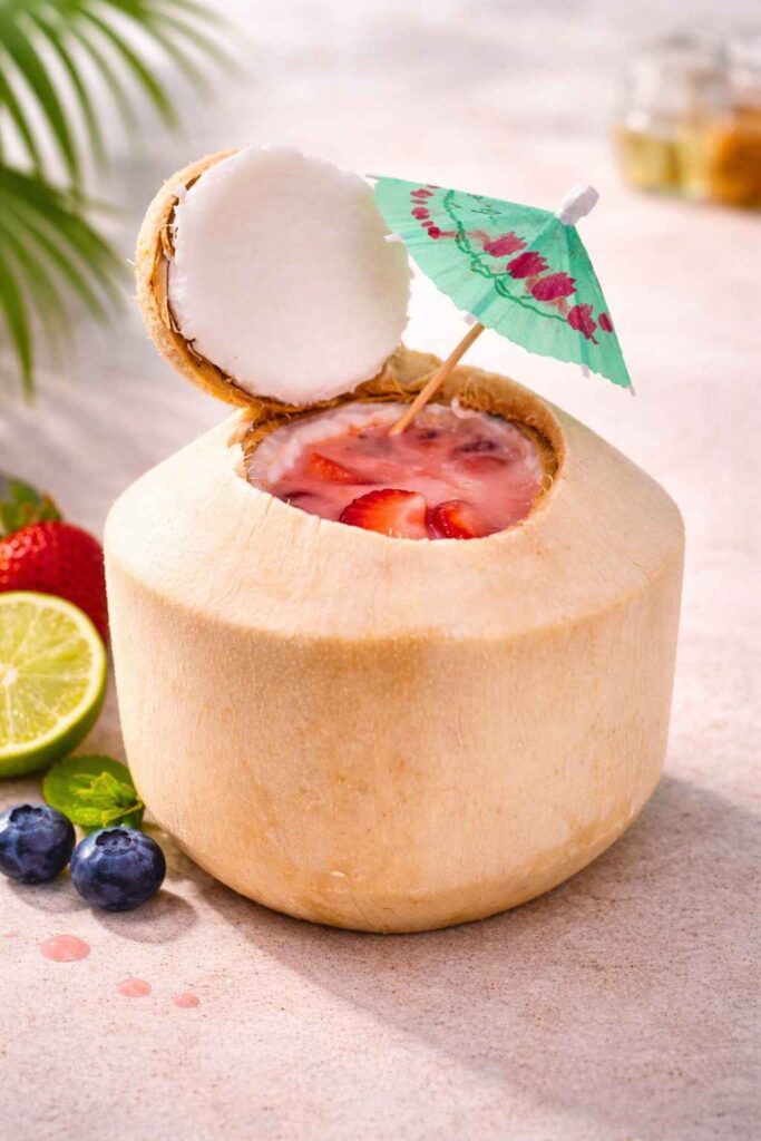 Beyond the flavor, what elevates the Strawberry Coconut Margarita from great to unforgettable is its presentation. Serving this cocktail inside a freshly opened Thai coconut shell is a showstopping move that transforms a drink into an event. The coconut’s naturally sweet water integrates directly into the cocktail, adding an authentic tropical character that no commercial coconut product can replicate. The cocktail umbrella signals celebration. The strawberry garnish signals craft. Together, they create a drinking experience that is photogenic, memorable, and deeply satisfying from the first look to the last sip.