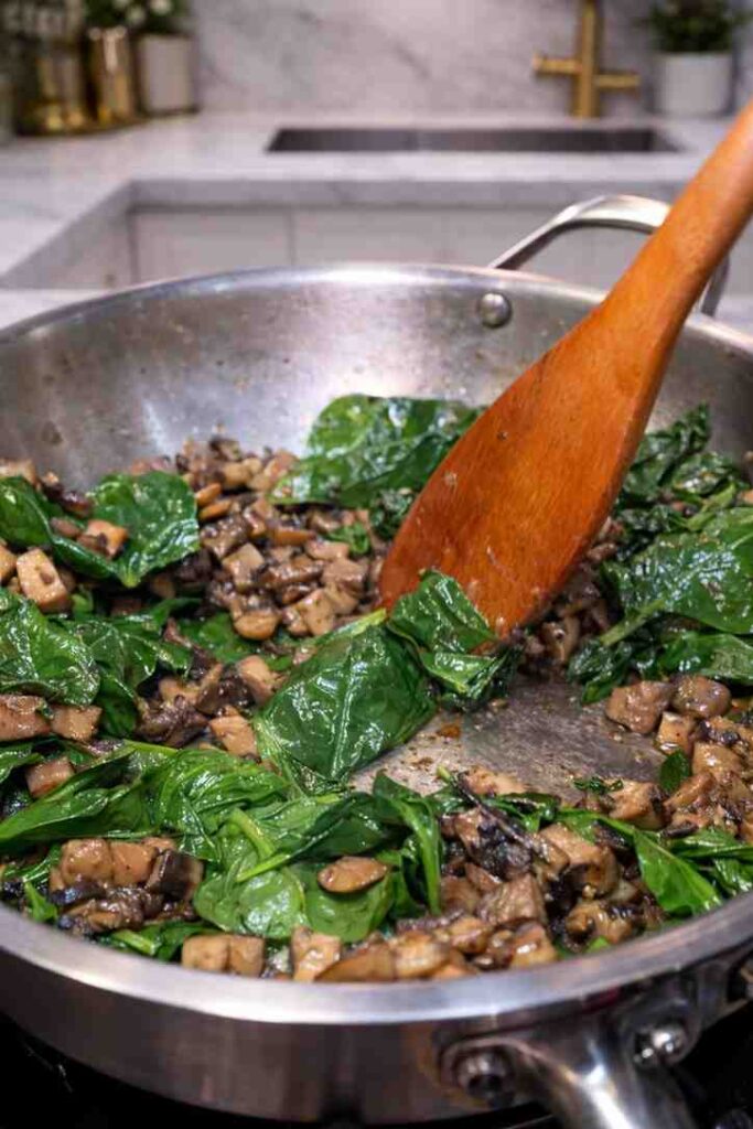 Add the sautéed mushroom and spinach mixture to the bowl and fold it in thoroughly. Every spoonful of the dip should have a good mix of cheese and mushroom. Taste the filling at this point and adjust the seasoning if needed.