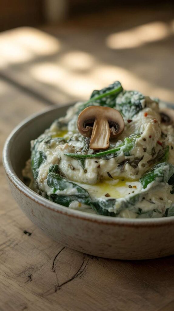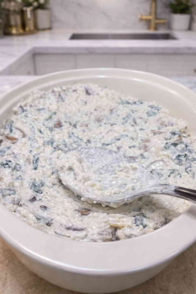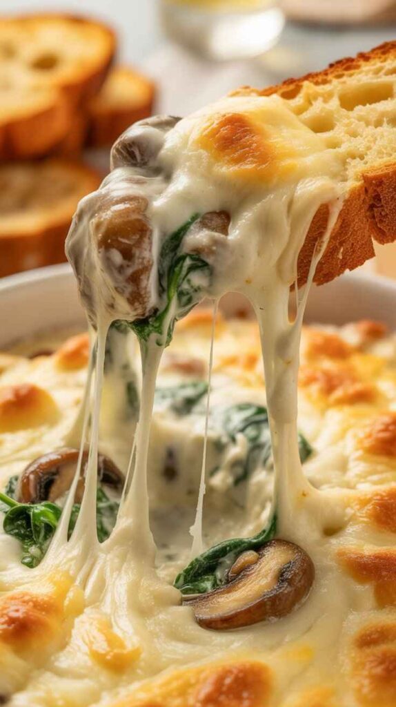 This is the kind of dish that disappears at parties. You set it on the table, and within minutes people are crowding around it, dunking bread, asking who made it, and quietly hoping there’s a second one in the oven. The combination of cream cheese, mozzarella, and Parmesan creates a filling that is luxuriously creamy, deeply savoury, and stretchy in the most satisfying way. The sautéed mushrooms and wilted spinach bring earthiness and colour, while the garlic powder ties everything together into one harmonious, irresistible bite.