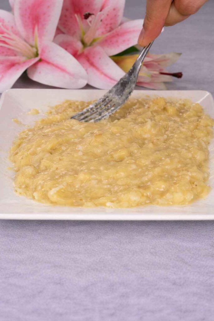 The bananas are peeled and then mashed thoroughly into a smooth consistency.