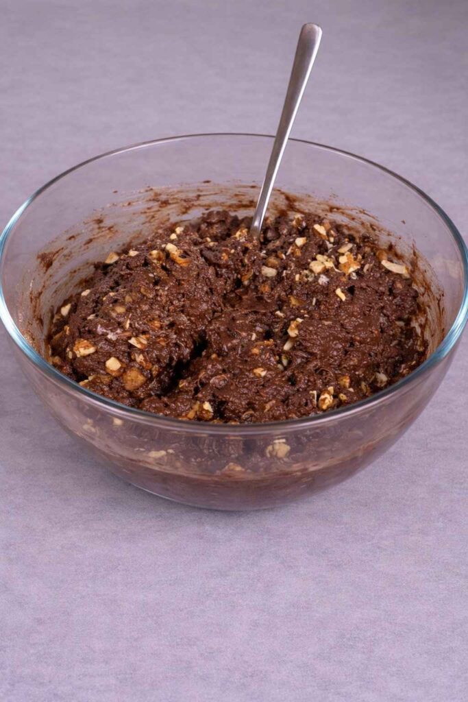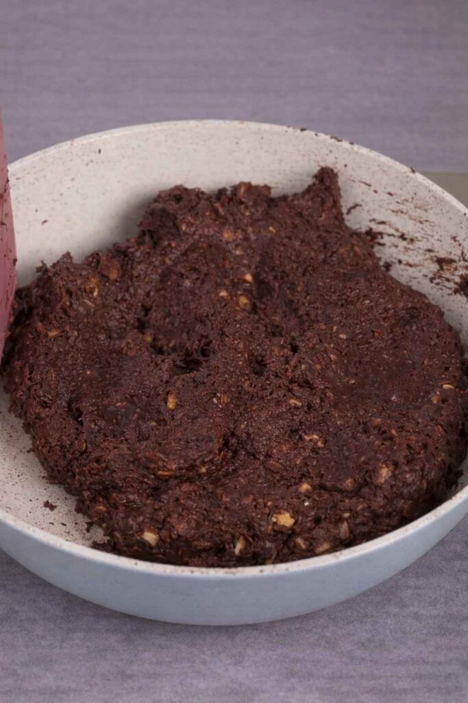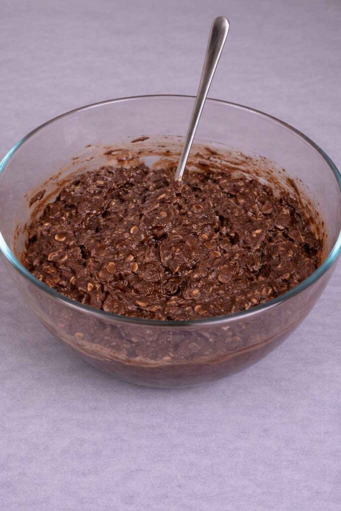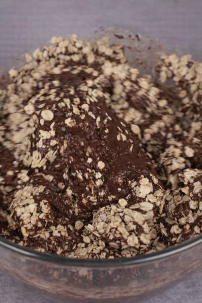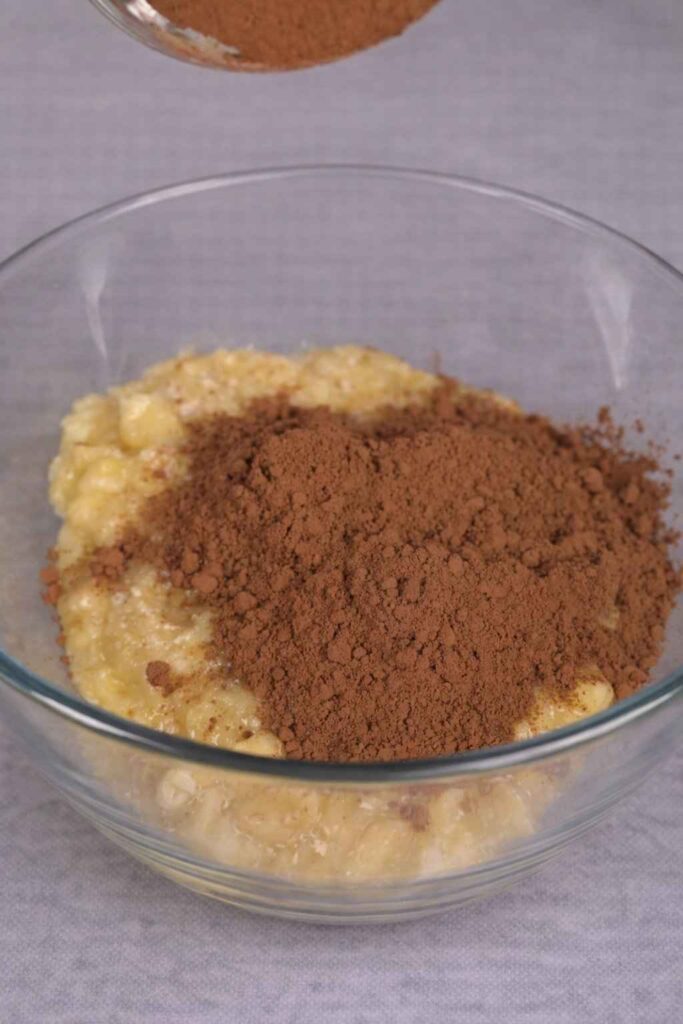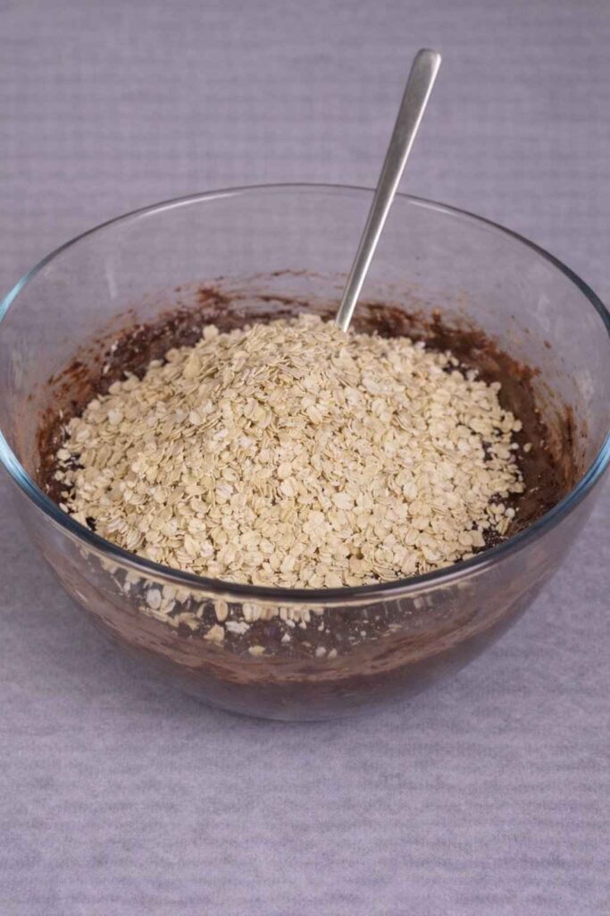 2. Mix the dry Ingredients: To the mashed bananas, add 1 cup of rolled oats and 3 teaspoons of cocoa powder that isn’t sweet. Mix well, making sure that the cocoa powder is properly mixed in and the oats are well covered by the banana mixture. This is the base for the “brownie” batter.