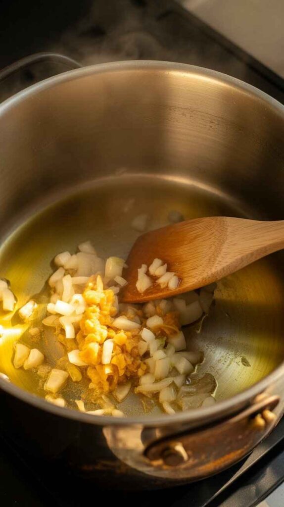 Add the chopped white onion, minced garlic, and freshly chopped ginger all at once. Stir everything together and sauté over medium heat for 5 to 7 minutes, stirring occasionally. You are looking for the onion to become completely translucent and soft, and for the garlic and ginger to become intensely fragrant. The smell at this stage should already be remarkable — warm, aromatic, and deeply inviting. Do not rush this step by turning up the heat, as properly softened aromatics create a much more rounded and flavorful base than ones that have been rushed or slightly scorched.