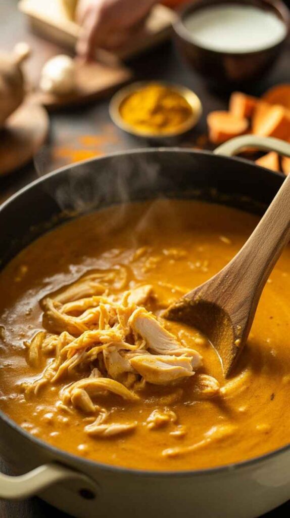 Return the pot to low heat and pour in the full can of coconut milk. Stir gently and continuously until the coconut milk is completely incorporated and the soup is a uniform, gorgeous golden-orange color. Allow the soup to warm through over low heat for 3 to 5 minutes, stirring occasionally. Do not let it boil vigorously at this stage — a gentle heat preserves the delicate, creamy character of the coconut milk.