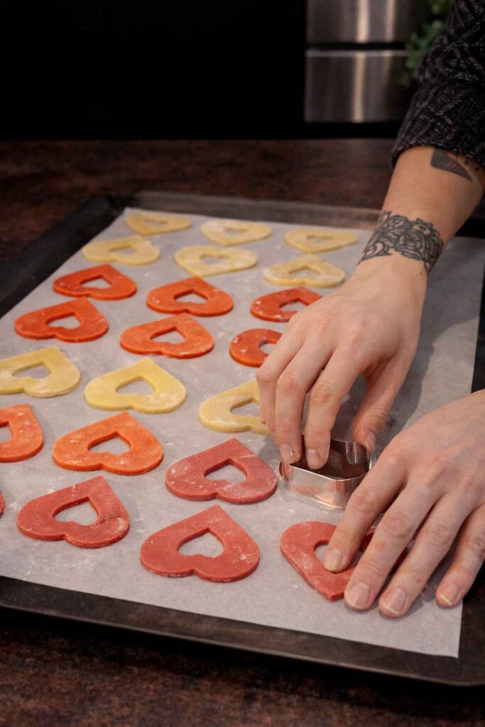 Roll each dough to 4mm thick. Cut large hearts, then use smaller cutter to remove centers.