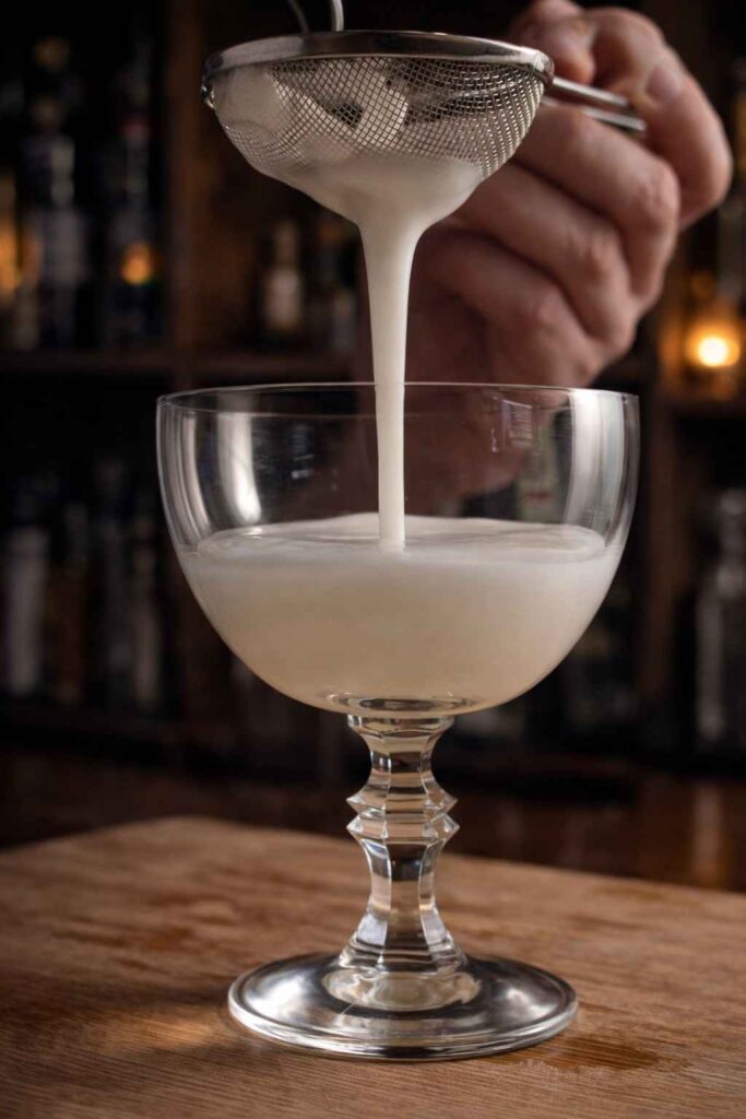 Place a Hawthorne strainer on top of the shaker and hold a fine-mesh tea strainer between the shaker and the chilled coupe glass. Pour the cocktail through both strainers simultaneously — this double straining technique catches both the larger ice shards held back by the Hawthorne strainer and the smaller ice chips and any fragments of unincorporated egg white caught by the fine mesh. The result in the glass should be a pearlescent, slightly opaque liquid topped with a thick, uniform, brilliant white foam.