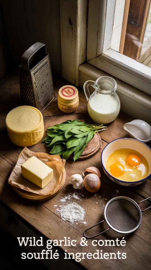 This is a recipe that comes together in well under an hour. It uses a short, sensible list of ingredients that you can find without visiting specialist shops. The technique involved is not complicated — it’s a béchamel sauce enriched with egg yolks and cheese, lightened with carefully whipped egg whites. That’s genuinely the whole story. The principles are straightforward, the steps are logical, and the result is something that looks and tastes extraordinary — golden-topped, cloud-light, with a crisp outer shell and a center that is soft, custardy, and absolutely packed with the deep, nutty flavor of Comté and the fragrant, springlike warmth of wild garlic.