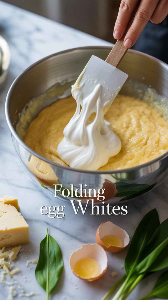 Add the egg whites to the cheese base in three separate additions. Use the first addition as a deliberate sacrificial loosener — stir it in with a relatively firm hand to lighten and loosen the thick béchamel base, making the subsequent folding much gentler on the remaining whites. For the second and third additions, use a large metal spoon or silicone spatula and a careful folding motion — cutting down through the center of the mixture, sweeping along the bowl’s base, then lifting and folding up and over. Rotate the bowl a quarter turn between each fold. Stop folding the moment no large streaks of white remain. Under-folded is always better than over-folded — a few small white streaks in the mixture are perfectly fine.