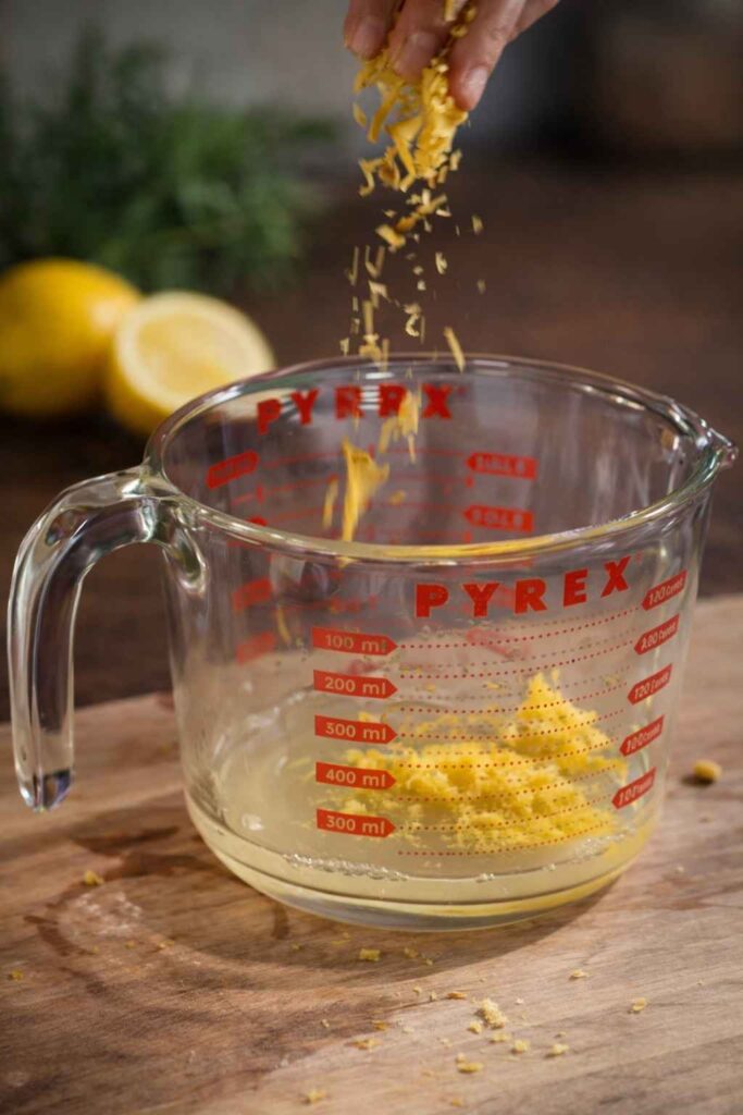 Before the chicken is touched, the marinade must be assembled — and it must be assembled with the correct sequencing of ingredients to maximize the flavor extraction from each component. Take the first lemon and zest it completely before cutting it for juicing — a firm, whole lemon provides the structural rigidity necessary for clean, controlled zesting, while a halved, partially juiced lemon is too floppy to handle cleanly against a microplane. Zest only the yellow flavedo layer — the outermost portion of the peel where the essential oil glands are concentrated — stopping before reaching the white pith beneath, which carries bitter limonin compounds that would introduce unwanted bitterness into the marinade. A properly zested lemon should yield approximately 1 teaspoon of fine, fragrant zest.